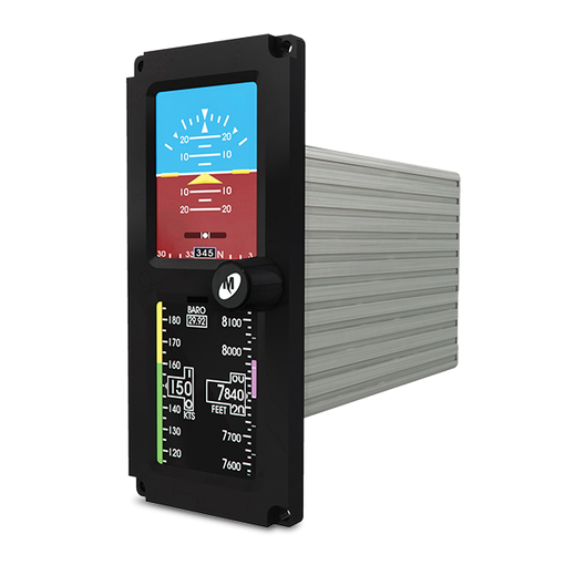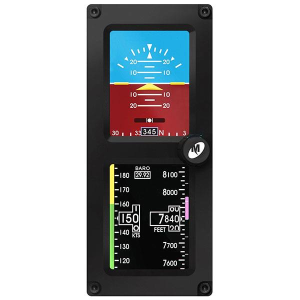 The MD302 Standby Altitude Module or SAM™ features a unique two-screen display that provides attitude, altitude, airspeed, slip, vertical trend, and heading information to the pilot during normal or standby operation in the event of primary instrument failure. This self-contained, solid-state instrument features a selectable orientation, horizontal or vertical, which allows flexible cockpit design and installation. The MD302 is also equipped with a rechargeable Nanophosphate® lithium-ion battery that provides up to one hour of emergency operation when fully charged.