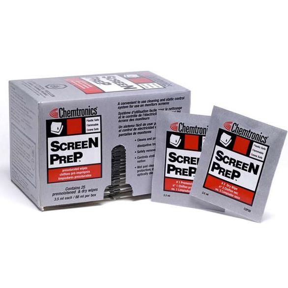 Chemtronics has designed a unique, two-part wet/dry cleaning and static control system. The Pre-saturated pad cleans and applies a static protection while the lint-free, polyester dry pad wipes the screen optically clear.