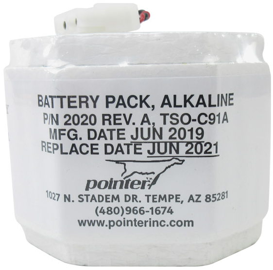 The 2020-0 alkaline battery pack supplies 7.5 volt power to Pointer model 3000 and 4000 series ELTs. This back is designed to protect factory fresh cells from shock and thermal vibrations in accordance with regulations. The patented formed-foam body snugly fits inside the ELT, thus resulting in vibration-free installation.