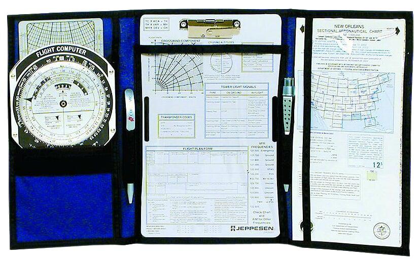 VFR Trifold Kneeboard with Clipboard - Jeppesen’s VFR Trifold Kneeboard places information at your fingertips. It organizes and holds charts, flight computers/plotters, flashlight, pen, pilot notes and more. An elastic leg strap sewn to the kneeboard holds this unit comfortably in place with a Velcro closure. Additionally, the foam-cradled back allows for added comfort and leg positioning. The metal clipboard includes valuable information for your VFR and IFR flight needs. Also includes a leg strap that allows you to use the clipboard independent of the kneeboard. Designed for superior strength, abrasion resistance and durability. (Size: 21" x 11-1/2" open.)