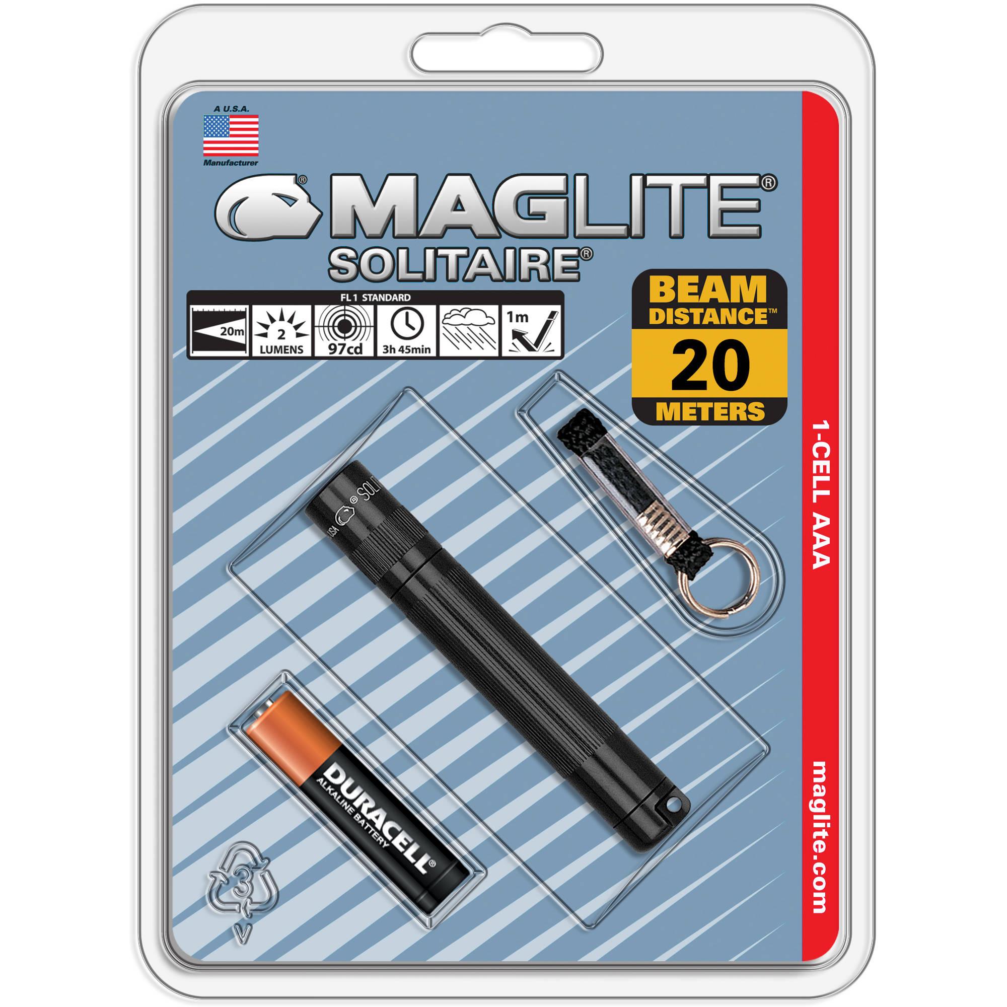 The high-intensity beam Solitaire by Maglite adjusts from a bright spot light to a wide flood light and provides a twenty feet of beam distance on one AAA battery. It has a rugged, machined aluminium knurled design which is anodized inside and out to provide excellent corrosion, water and shock resistance, and also contains a spare lamp securely held inside the tail cap.