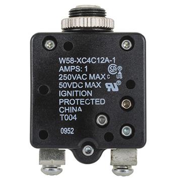 The W58 series are secondary panel-mount thermal circuit breakers with a push to reset actuator and series trip function. The thermal type breakers have an interrupt capacity of 2000 amps at 50 VDC and 1000 amps at 250 VAC. The button color has white with black rate marking with a red trip band.
