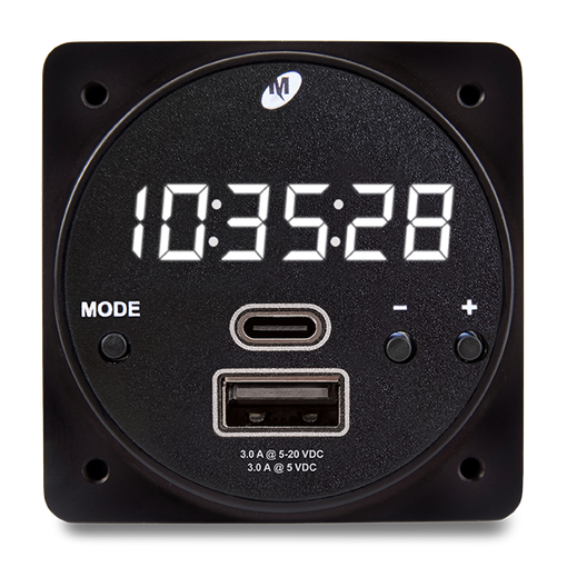 Combine time keeping and USB charging power in one essential unit with the CHRONOS CH93MAX digital clock. MAX Power USB-C PD and USB-A charging ports can simultaneously charge two devices. The TSO-certified CH93MAX offers 8 modes and is an ideal replacement for older, single-function clocks.
