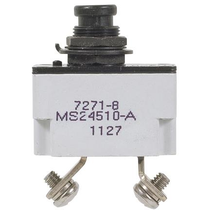 The Klixon® 7271 series circuit breakers are designed to utilize less space behind the panel while protecting wire and cable in aircraft and ground support equipment on 120 VAC, 400 Hz or 30 VDC systems. Inherently resistant to shock and vibration, the disc element is capable of calibration within close tolerances throughout the service life of the breaker. The 7271 series circuit breaker feature a single pole, push button actuator that pops out for trip indication.