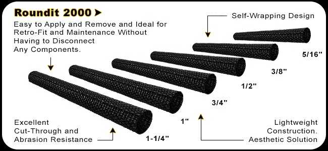 Roundit® 2000 self-wrapping sleeves are tough and lightweight oversleeves used to bundle and protect cable assemblies, hoses and wire harnesses from chafing, cutting, and abrading. Roundit’s self-wrapping feature allows for quick application and removal for assembly and maintenance. It may be applied and removed without disturbing connectors or fittings. Roundit® 2000 is rated to 125°C and has applications in aeronautical, electronic, furniture accessory and general manufacturing industries.